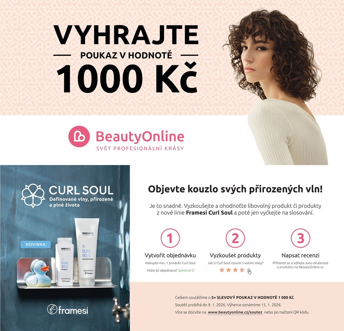 • Soutěžit může každý, kdo si od nás na e-shopu BeautyOnline.cz zakoupil některý z produktů nové řady Framesi Morphosis Curl Soul pečující o vlnité a kudrnaté vlasy a vloží recenzi, přičemž platí soutěžní období od uvedení produktů na trh, tedy od 1. 10. 2025 do 9.1. 2026.!